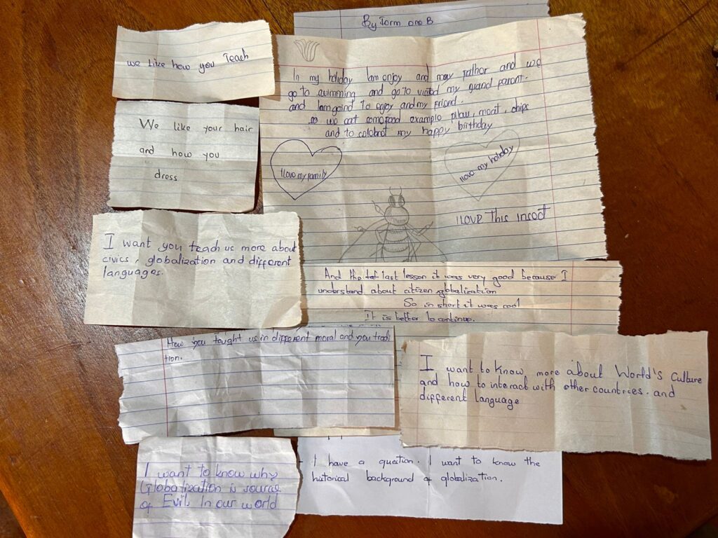 Ogni settimana, prima di entrare in classe costruiamo la lezione, cercando di seguire un filo comune partendo da quello che ogni classe ci restituisce autonomamente. Venerdì ad esempio abbiamo rivisto dopo due settimane di vacanze scolastiche il Former I (ossia il primo anno) e visto che la partecipazione è ancora in costruzione, abbiamo proposto di scrivere su dei bigliettini in forma anonima come fossero andate le vacanze a casa, cosa fosse successo di bello o di spiacevole, cosa ne pensassero delle lezioni fatte finora e infine cosa volessero vedere nelle prossime.